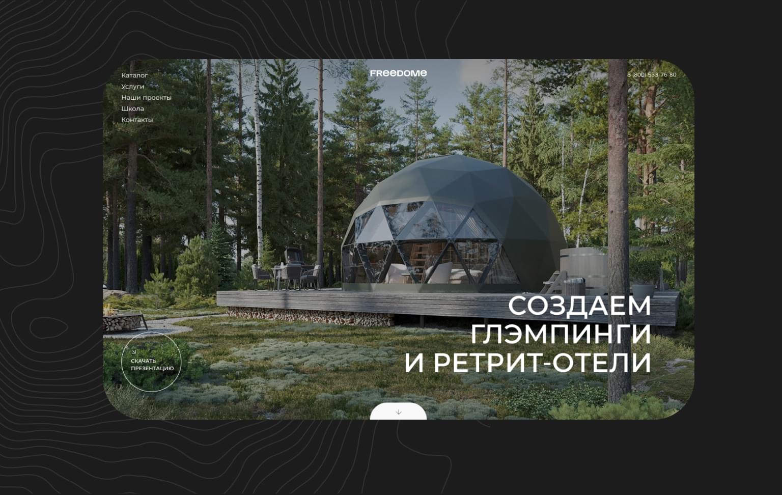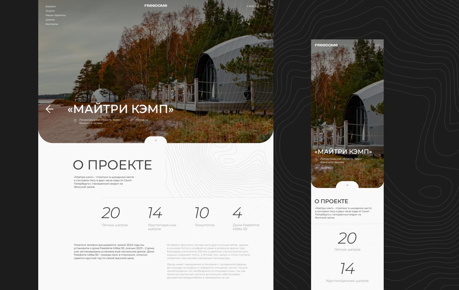 Изначальной задачей было создать дизайн-макет сайта для производителя необычных купольных домов и команды, момогающей сткрывать глэмпинг-отели по всему миру. Также данный проект находится у меня на дизайн-сопросождении с 2022 года.