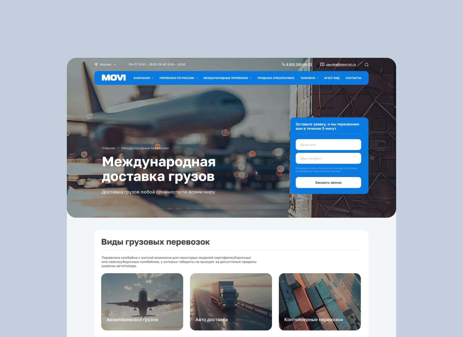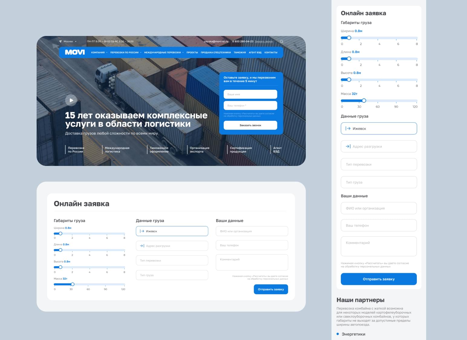 MOVI — транспортная компания, осуществляющая международные перевозки крупногабаритных и тяжеловесных грузов и специализирующаяся на сложных логистических решениях. Задача: создать сайт компании под ключ.